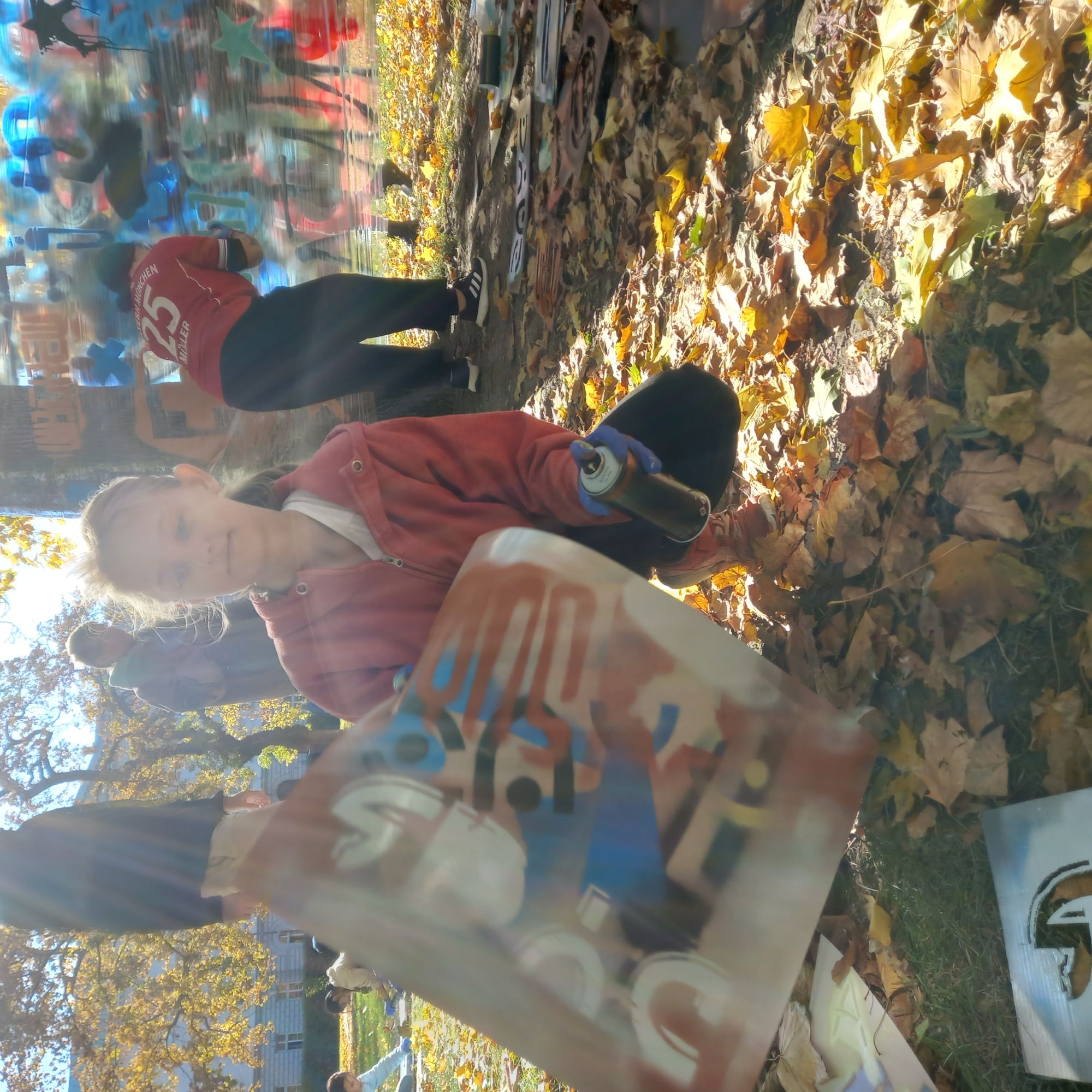 Ve čtvrtek 23.10. se žáci deváté, osmé a sedmé třídy setkali se známým opavským streetartovým umělcem Vojtou Králem. Na úvod si děti ve třídě na videu prohlédly ukázky z Vojtovy tvorby a seznámily se se základními pojmy. Povídaly si o tom, co je to UMĚNÍ, STREET ART, VEŘEJNÝ PROSTOR, GRAFFITY…apod. Pak už ale přišel čas na akci a na to, na co se všichni nejvíc těšili, totiž sami si vyzkoušet vlastní tvorbu se spreji. Všichni žáci se pustili do tvoření s velkým elánem. Používali šablony, ale také vlastní fantazii. Malovali na papíry, ale i na velikou fólii, nataženou mezi stromy. Někteří si zkusili výtvarně ztvárnit svůj podpis. Ve čtvrtek bylo nádherné počasí a k podzimní paletě barev přidali naši žáci ještě své vlastní barevné vyjádření. Odměnou jim bylo ocenění od samotného mistra Vojty, pochvaly od svých pedagogů, moc povedené obrázky a hlavně krásný pocit z velmi vydařené akce.