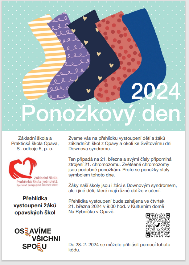S podporou Magistrátu města Opavy připravujeme k mezinárodnímu Dni Downova syndromu další ročník přehlídky vystoupení dětí a žáků škol z Opavy a okolí. Akce se uskuteční 21. března 2024 v kulturním domě Na Rybníčku v Opavě. Ponožky na akci poskytuje a vyrábí firma Moravec podle návrhů našich žáků.